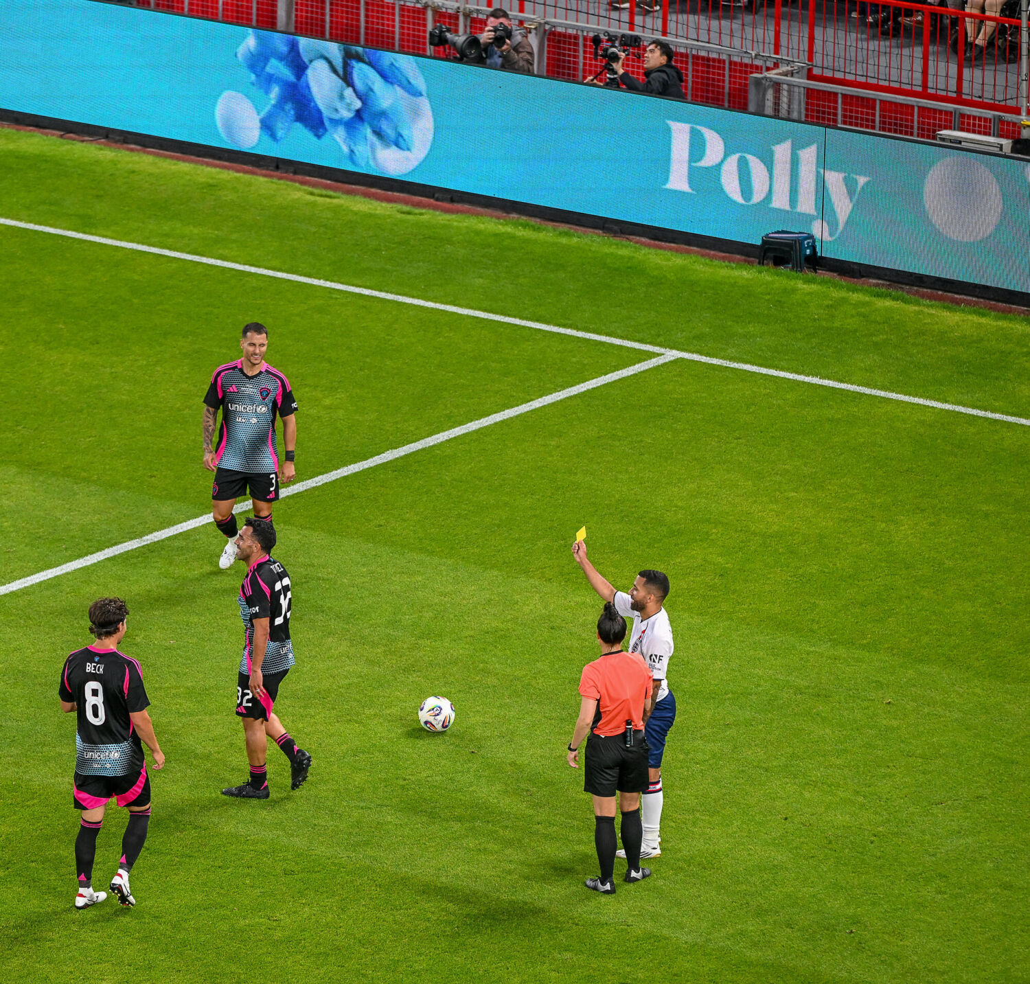 Carlos Tevez is shown a yellow card by Aaron Lennon on behalf of Referee Rebecca Welch during Soccer Aid for UNICEF 2025 taking place on Sunday 15th June at Old Trafford, Manchester. Photographed by Daniel Hambury for UNICEF UK and Soccer Aid Productions. ©UNICEF/Soccer Aid Productions/Stella Pictures For further information, please contact [email protected]